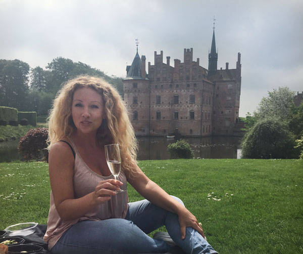 Min omvisning på Egeskov slott kulminerte i en deilig picniclunsj på plenen bak slottet. Jeg mistenker at grev Ahlefeldt må ha hørt champagnekorkene sprette fra sigarsalongen, og at det var derfor han bestemte seg for å hoppe i robåten sin og ro over vollgraven for å bli med på moroa.