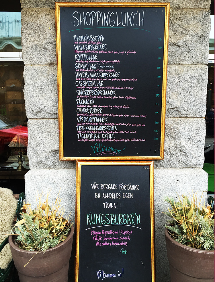 Etter den sinnssyke frokosten, trodde jeg at jeg aldri skulle bli sulten igjen, men ved 15-tiden begynner det jammen å rumle. Vi har fått anbefalt Restaurant Kungstorget der det serveres shoppinglunsj fram til klokka 17. Det er masse å velge i, men jeg går for en lett hamburger (nå er jeg ironisk…) med baconkrem og cheddarost, stekte poteter og aioli… Klarer jeg å reise meg fra stolen etter dette?