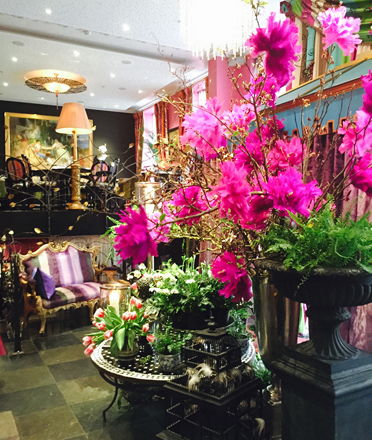 Det bugner av kunst, blomster, dekorasjoner, fløyel og silke, og de ansatte ser ut som de er tatt rett ut av en fransk film. Dette er et populært sted for afternooen tea og drinker, og nå sitter jeg og drikker en cider midt på lyse dagen. Det er bare å nyte så lenge jeg klarer. Om noen timer går toget hjem til Oslo, og hjemme venter hverdagen og tre kule karer. Det er jo ikke så verst det heller.